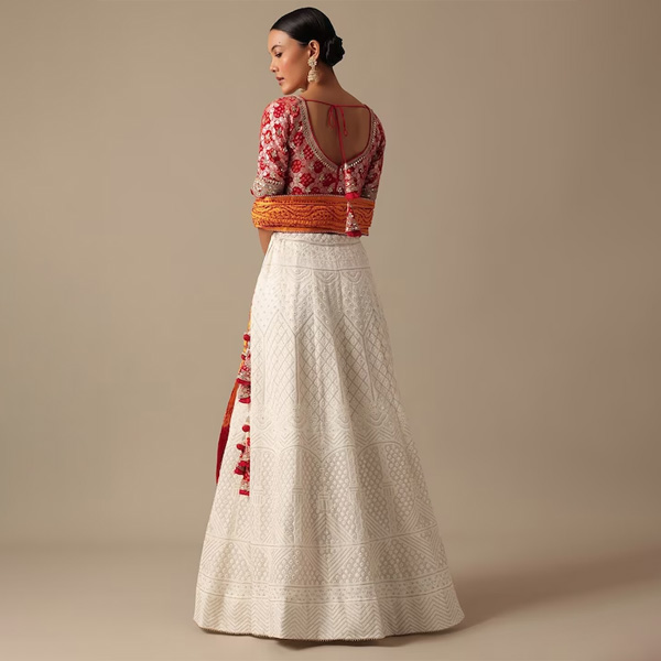 White, red & yellow Embroidered ready to wear lehenga, has drawstring closure