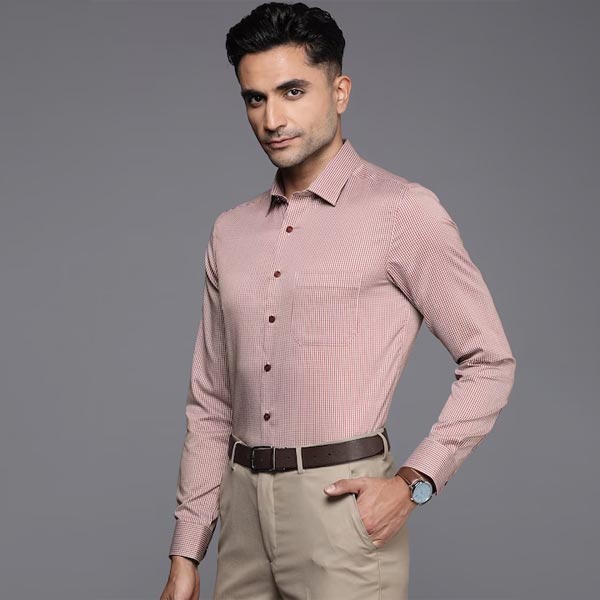 Rust red and White checked Formal shirt, has a cutaway collar, button placket, 1 patch pocket, long regular sleeves, curved hem